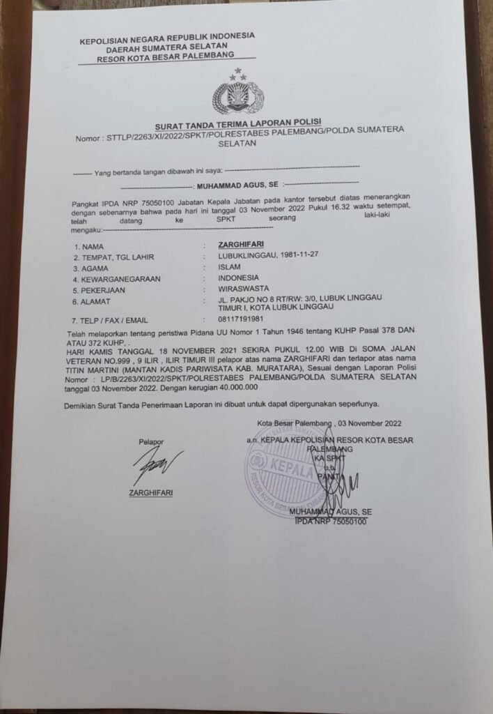 PALEMBANG – Mantan Kepala Dinas Kebudayaan dan Pariwisata (Disbudpar) Kabupaten Musi Rawas Utara (Muratara), Titin Martini dilaporkan Zarghifari ke Polrestabes Palembang, atas dugaan Penipuan dan atau Penggelapan, Kamis (03/11/2022).