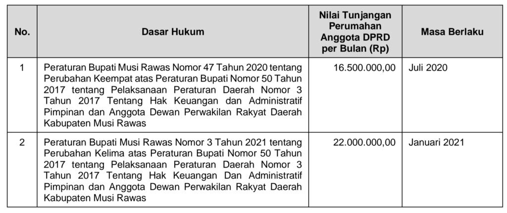 Nilai Belanja Tunjangan Perumahan Anggota DPRD berubah pada Tahun 2020 dan untuk nilai Tahun 2022 dan 2021 mengacu pada Peraturan Bupati Musi Rawas Nomor 3 Tahun 2021 tanggal 15 Februari 2021 sebagaimana tabel berikut.