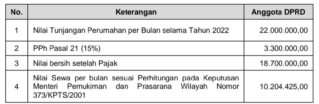 Berdasarkan Laporan Hasil Pemeriksaan (LHP) Badan Pemeriksa Keuangan (BPK) atas dokumen penetapan Tunjangan Perumahan Anggota DPRD Tahun 2022 diketahui bahwa penetapan besarnya Tunjangan Perumahan tidak diatur dalam standar satuan harga sewa rumah dinas Tahun 2022 yang dapat dijadikan acuan dalam menetapkan Tunjangan Perumahan Anggota DPRD.