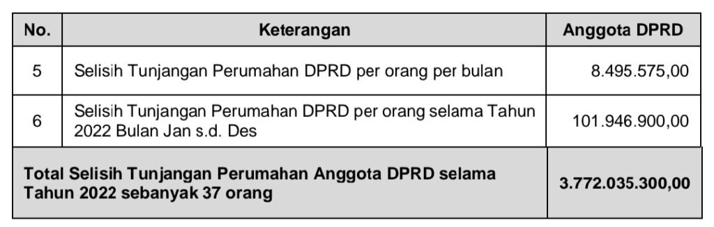 Berdasarkan perhitungan di atas, menunjukkan bahwa terdapat selisih nilai pemberian Tunjangan Perumahan sebesar Rp3.772.035.300,00 dari total yang diterima oleh Anggota DPRD selama Tahun 2022.